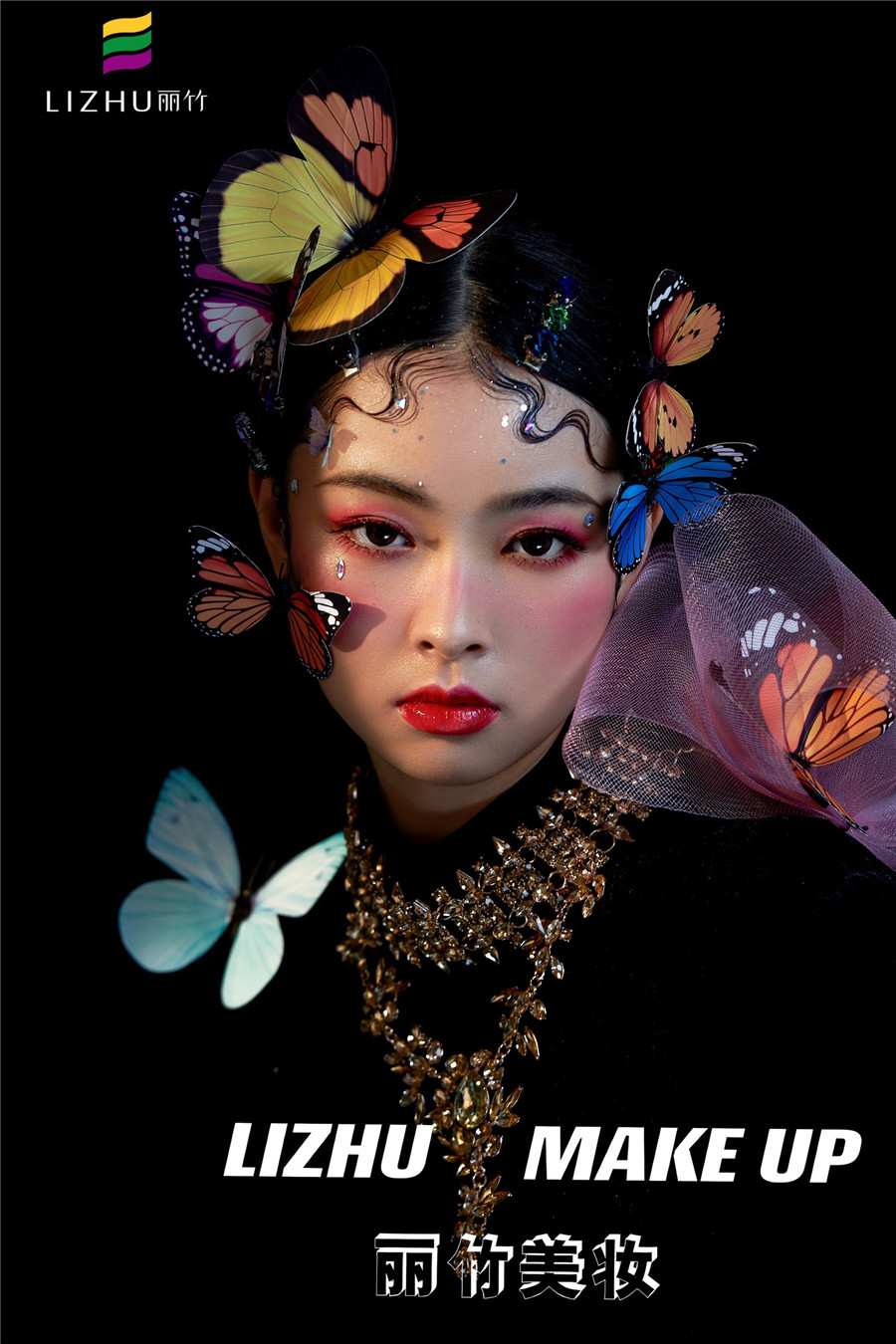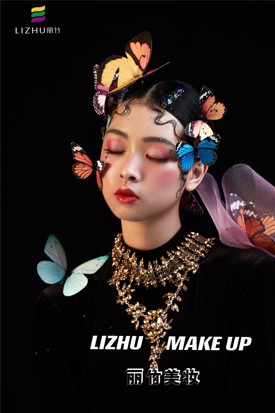 麗竹化妝學(xué)校作品---唯美蝴蝶妝容:肩頭兩鬢和眼前額頭,被五彩斑斕的蝴蝶點綴,強(qiáng)烈的黑色背景搭配亮眼色差,產(chǎn)生了很強(qiáng)的視覺效果,讓人過目不忘之余,更寓意破繭成蝶涅槃重生的狀態(tài)。