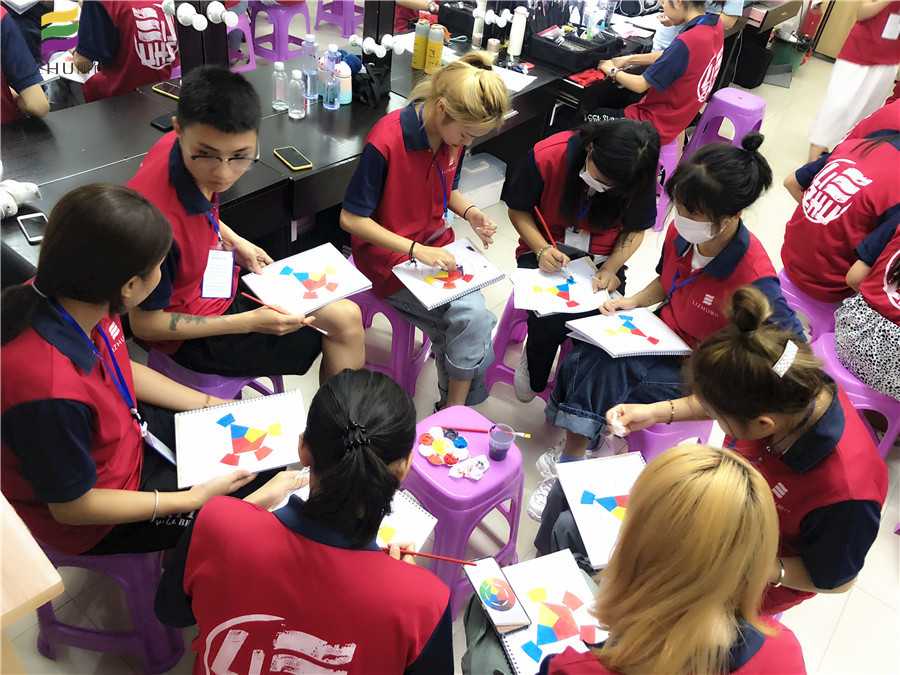 如果你認(rèn)為這只是簡單在相應(yīng)的空格里上色,那就錯(cuò)了。學(xué)過彩妝,美甲,美發(fā)的人都知道,色彩分有冷色系和暖色系,在學(xué)習(xí)色彩搭配的時(shí)候,學(xué)員必須要對(duì)這兩類色調(diào)的顏色分清,同時(shí)還要有能進(jìn)行冷暖色調(diào)進(jìn)行調(diào)配的能力。而同學(xué)們正在做的就是這個(gè)練習(xí)。