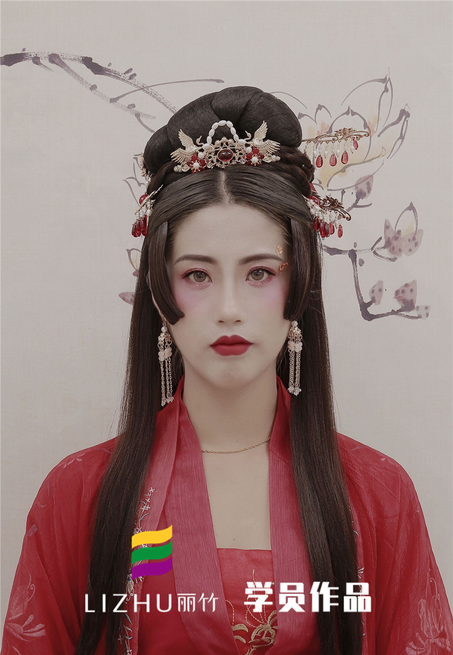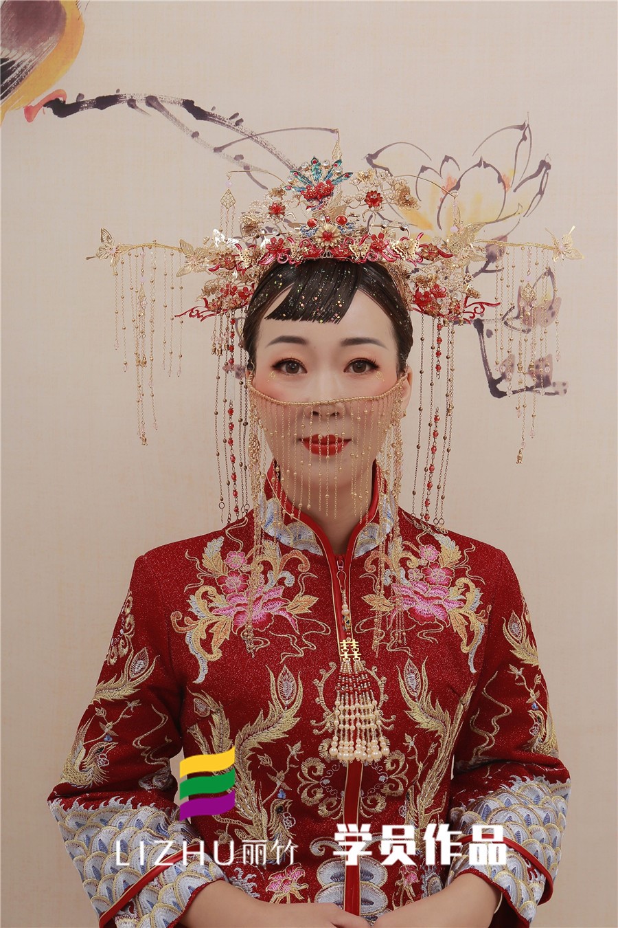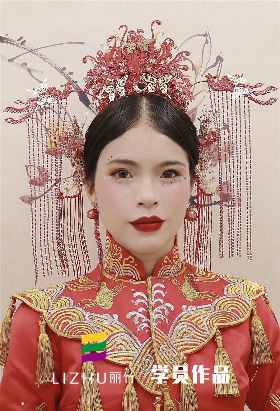 南寧化妝培訓(xùn)學(xué)校課堂:“虹裳霞帔步搖冠, 鈿瓔累累佩珊珊?!痹谌松钚腋5哪翘欤缢谷A麗裝扮:纓絡(luò)垂旒,玉帶蟒袍,著百花裥裙,穿大紅繡鞋。一抹濃艷滿身喜慶,一如心中幸福滿溢,又何止美哉!