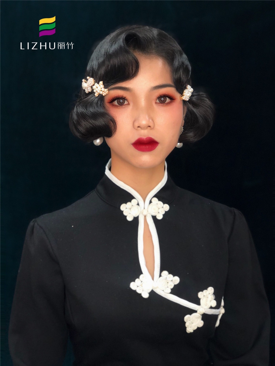廣西彩妝造型培訓(xùn)學(xué)校作品---旗袍妝容造型:流暢圓潤的復(fù)古手推波發(fā)型,涂抹婀娜多姿的烈焰紅唇,身穿黑色改良國風(fēng)旗袍,還原老上海復(fù)古風(fēng)情,優(yōu)雅復(fù)古韻味十足。
