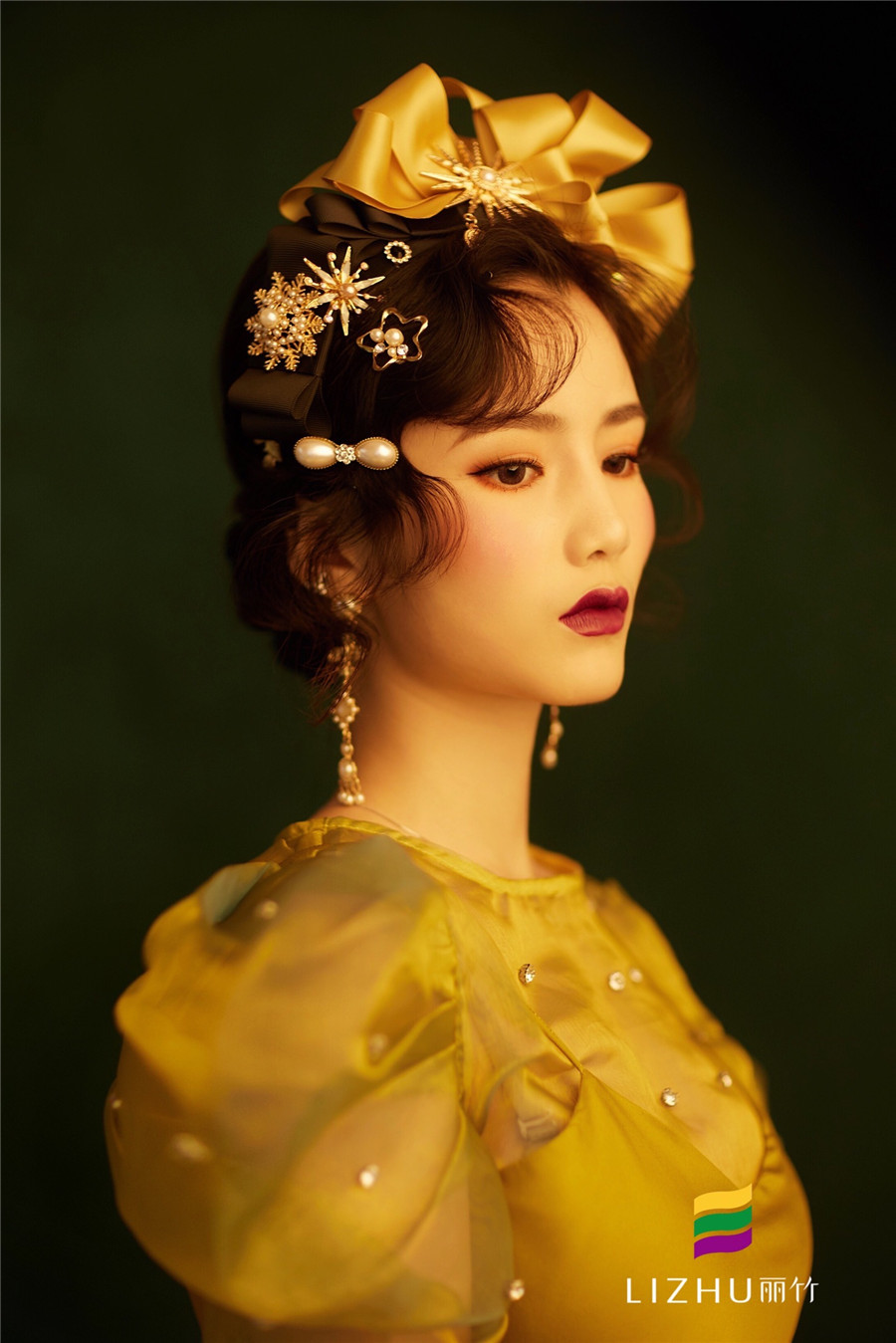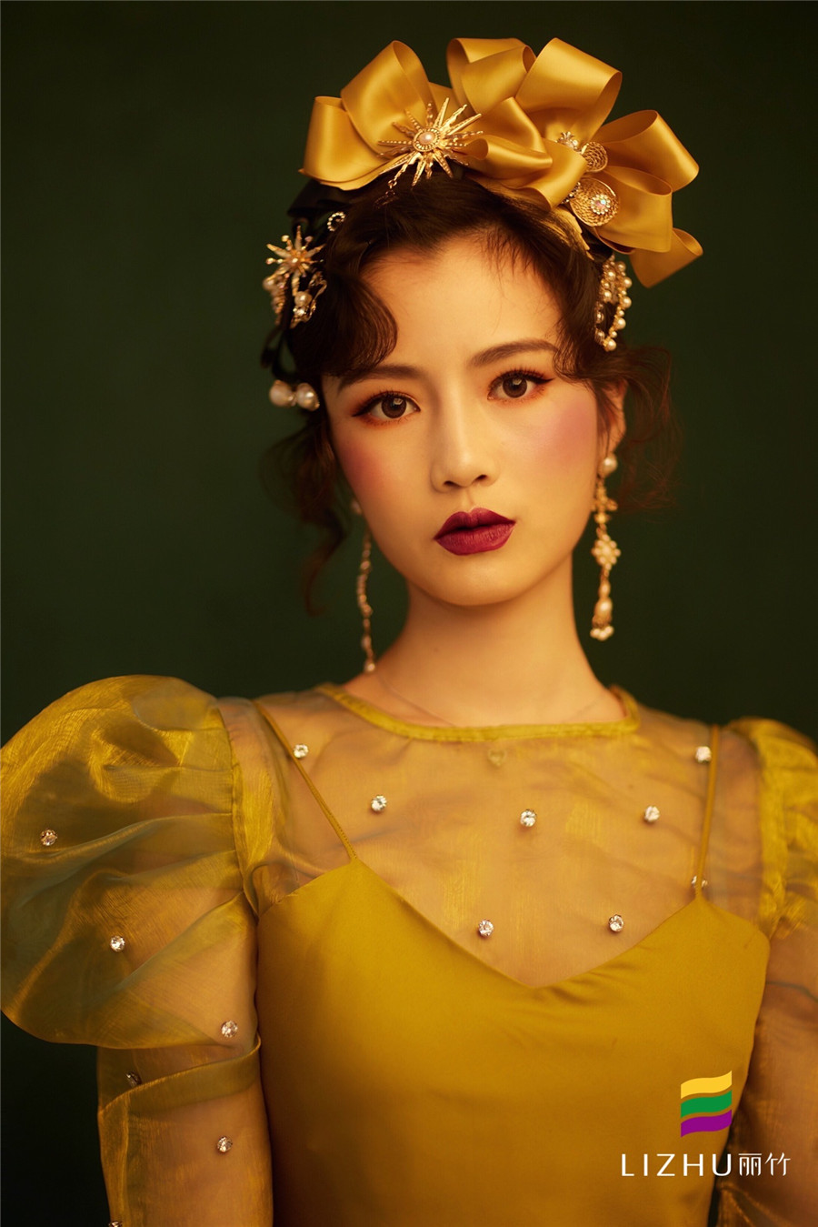 油畫妝容造型:復(fù)古手推波營造的優(yōu)雅感,佩戴金光亮閃的珍珠頭飾,極具張力的色系妝容打造,營造出了古典優(yōu)雅韻味,又不可抗拒的文藝氣息,如油畫里走出來的女王。