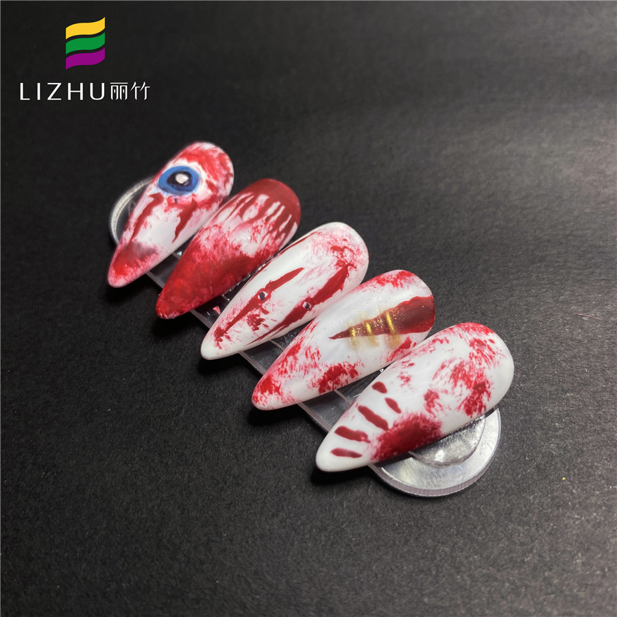 血 跡美甲圖案,白色的底色上面配上血紅色的細(xì)絲線,做成血絲的機(jī)理,一款適合恐怖角色的美甲圖案哦,什么吸血鬼、惡魔都可以試試。