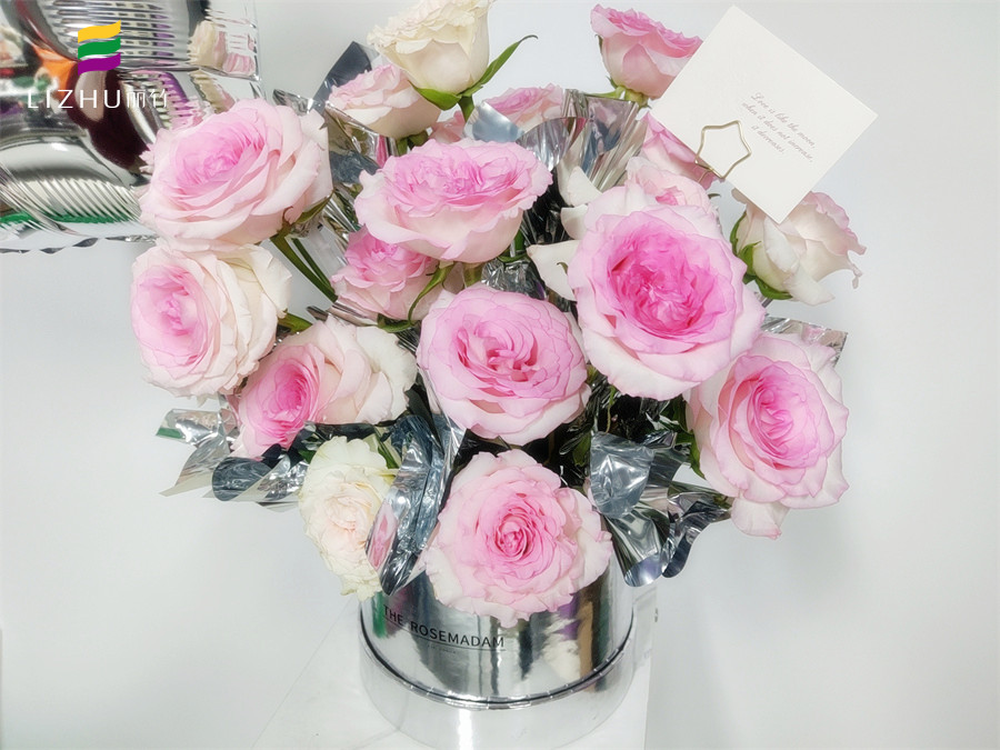 首先找到一個圓筒狀的道具(根據(jù)你的喜好來決定大?。?,包上你喜歡的銀色包裝紙,然后將花泥放進桶內(nèi)。主花的位置確定好之后,以主花為高點,按照高低排列的順序以此圍繞展開,直至形成你想要的花束輪廓出現(xiàn)。
