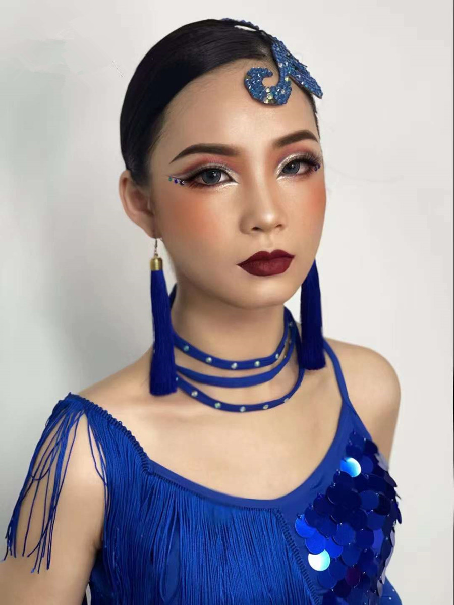 南寧學(xué)舞臺妝、南寧彩妝培訓(xùn)舞臺妝作品---拉丁舞妝:因為跳拉丁舞的演員需要在聚光燈下,站在舞臺或是指定的場所表演,而觀眾又只能遠距離觀看,所以在畫舞臺妝的時候,用到的色彩,特別是眼妝部分更加需要顏色艷麗的眼影去進行有層次感的描繪,這樣才能讓妝容看起來更醒目。