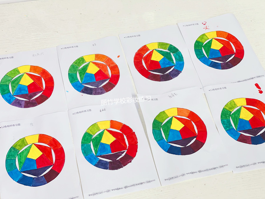 化妝基礎(chǔ)理論知識、南寧化妝基礎(chǔ)教學(xué):在今天的南寧化妝課堂上,學(xué)員們在聽完玉老師講解的關(guān)于色彩十二色環(huán)的理論知識后,便拿出畫筆顏料,根據(jù)三原色,冷暖色系的搭配等,進(jìn)行十二色環(huán)紙上練習(xí)。下面,和南寧化妝師培訓(xùn)學(xué)校-麗竹化妝培訓(xùn)一起學(xué)看看學(xué)員們的練習(xí)成果如何吧?