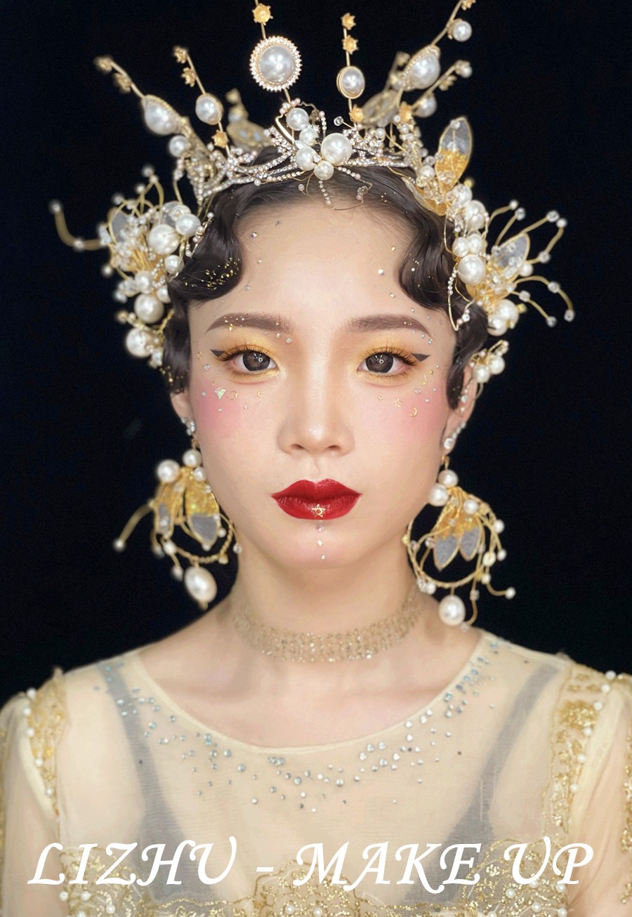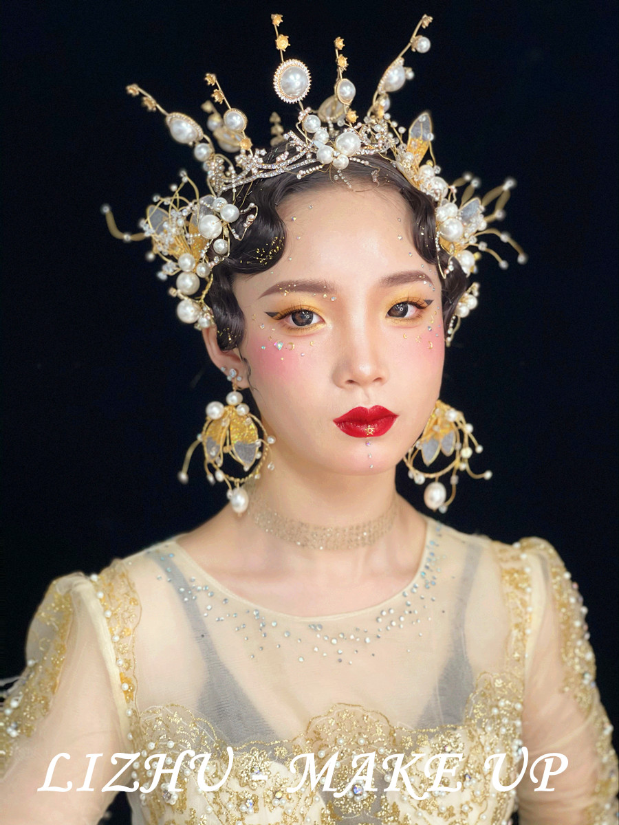 廣西彩妝創(chuàng)意培訓(xùn)學(xué)校作品欣賞:復(fù)古手推波高聳發(fā)髻,金黃高奢珍珠碎鉆發(fā)飾點綴,佩戴同款奢華大氣耳飾,烈焰紅唇襯托大氣底妝,金屬亮片飾品裝飾整臉妝容,身穿重工釘珠打造禮服,氣場強大的高奢妝容造型映入眼簾。