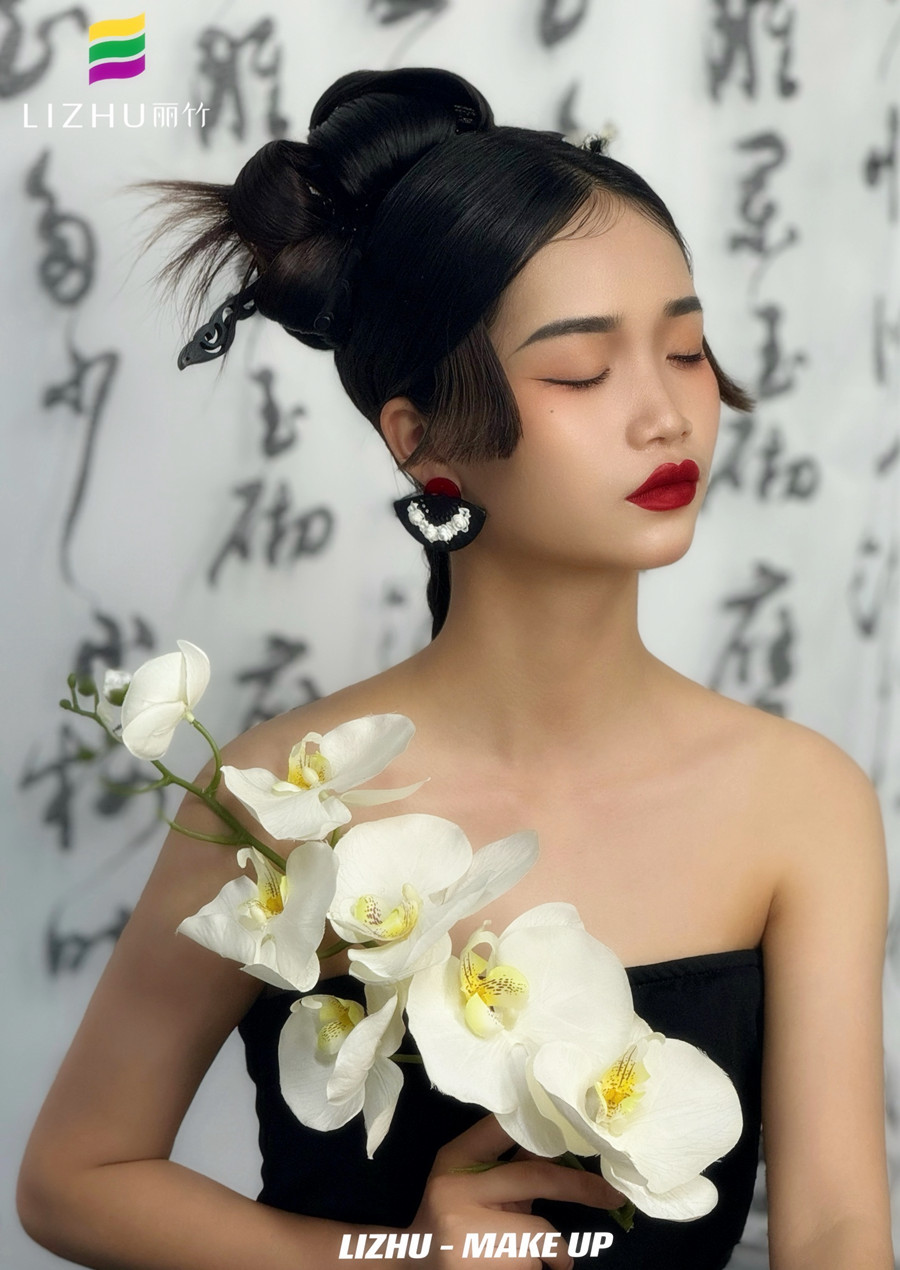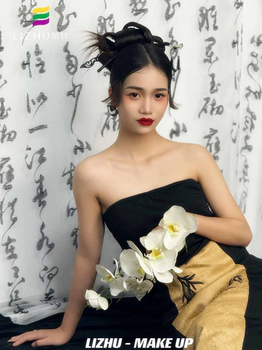 南寧新娘化妝師培訓、南寧寫真化妝學習作品---新中式造型:一套改良版露肩中式套裝,搭配簡約利落中式盤頭,將東方的優(yōu)雅和現代女性風格融合,整個造型流露出一種文人筆墨下的詩意。如果你想近期在南寧學新娘化妝,那么千萬不要錯過南寧人物寫真化妝學校-麗竹學校年末感恩答謝會的學費特惠福利啦!