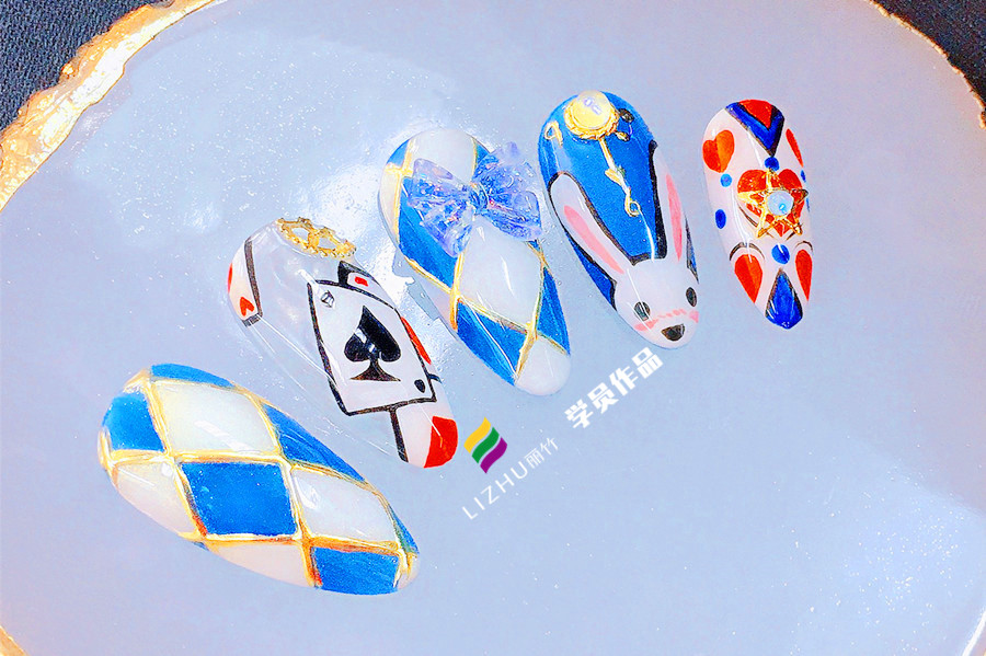 南寧美甲進修、零基礎(chǔ)美甲學(xué)習(xí)作品---歡樂馬戲團:整副作品采用藍色和與白色相互搭配,用彩繪的畫法進行描繪,栩栩如生的撲克與兔子圖案,更顯趣味,營造出了一副青春洋溢的氛圍感。在南寧學(xué)美甲,為什么選南寧美甲學(xué)校-麗竹學(xué)校?是因為在南寧美甲培訓(xùn)取得成功的美甲技能人口相傳的好口碑,是全國賽事獲獎無數(shù)的專業(yè)認定!