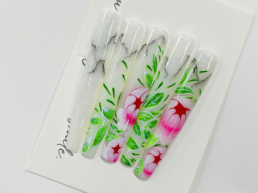 美甲技法:作品主要以為彩繪為主,暈染為輔。通過細(xì)膩的筆觸描繪出花紅柳綠,群山連綿的輪廓。在用暈染的方式打造出鮮花,群山相互交映的視覺上沖擊感,將一副上春山的美景印入眼前。