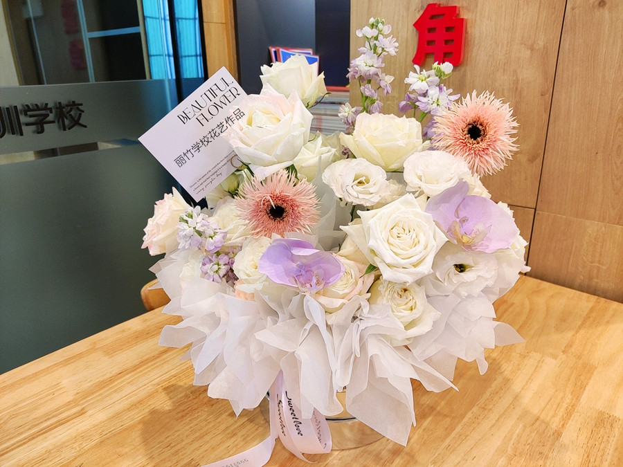 看吧!在老師的指導(dǎo)下,還有同學(xué)們自己的努力下,一個(gè)清新養(yǎng)眼且浪漫十足的白色玫瑰花抱抱桶就完成啦!純白無瑕的花束下,代表了不摻雜任何瑕疵的愛情,想必收到這個(gè)花藝作品的女孩定會(huì)十分歡喜。