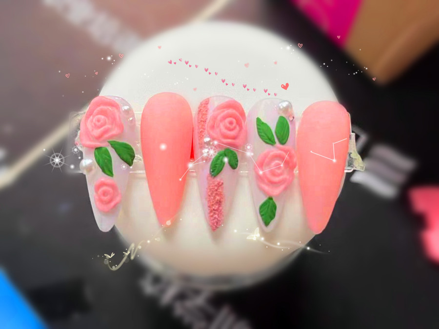 以粉色作為整副美甲作品的主要色調(diào),粉白色作為次配色調(diào)。之后用雕花膠捏出粉色的玫瑰花瓣,然后在捏出綠色的葉子進(jìn)行襯托。為了增加整副作品的氛圍感,任意在有花瓣的甲片上粘貼大小不一的珍珠飾品進(jìn)行點(diǎn)綴,將浪漫,甜美的感覺(jué)拉到蕞大值。