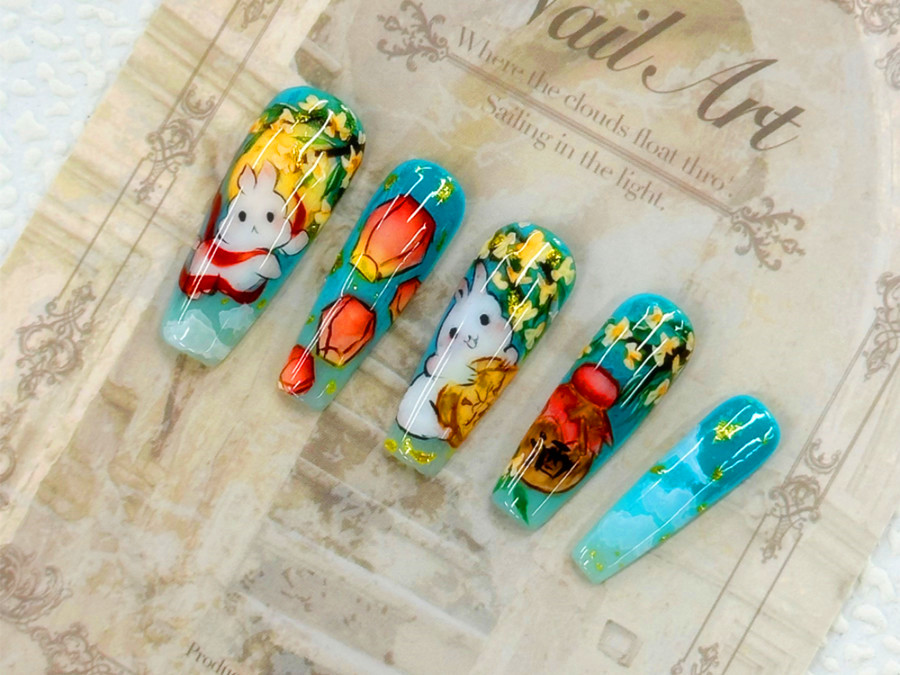 美甲圖片2024新款式、南寧美甲店推薦:說起中秋元素,怎么能少得了玉兔,桂花樹,美酒佳肴還有孔明燈呢?在團圓之際,不如也讓你的手一起感受中秋的美好吧?