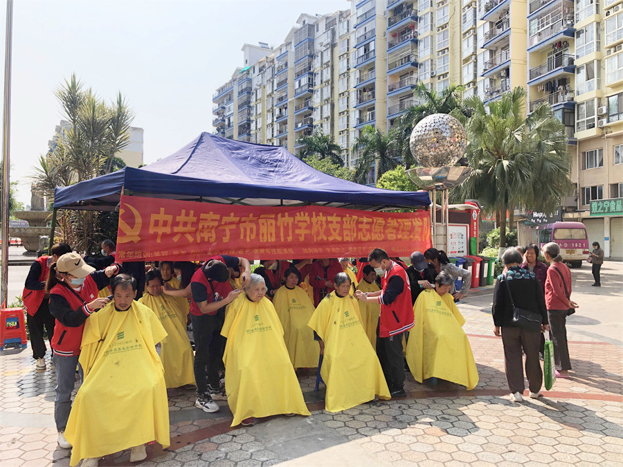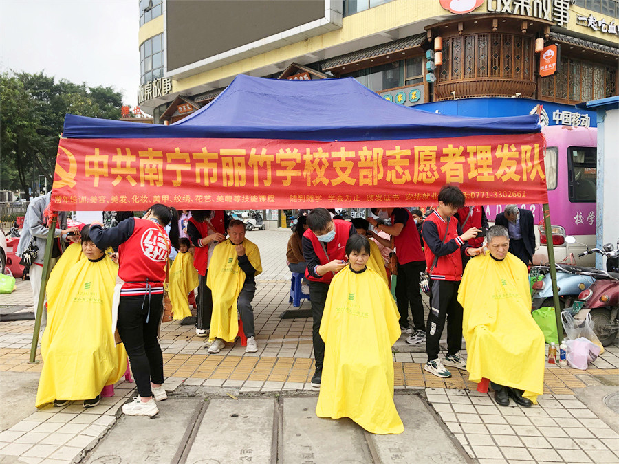 廣西南寧市美發(fā)實(shí)踐活動(dòng)、廣西美發(fā)學(xué)校社區(qū)義剪、麗竹學(xué)校美發(fā)公益活動(dòng):在群眾們一聲聲地感謝聲中,廣西老牌美發(fā)師學(xué)校-中共南寧市麗竹學(xué)校支部志愿者理發(fā)隊(duì)4月公益活動(dòng)圓滿結(jié)束啦如果你想學(xué)美發(fā)在廣西,想知道廣西學(xué)美發(fā)哪家好?麗竹學(xué)??诒c專業(yè)并存,聲名在外,歡迎大家到校咨詢,參觀,報(bào)名!