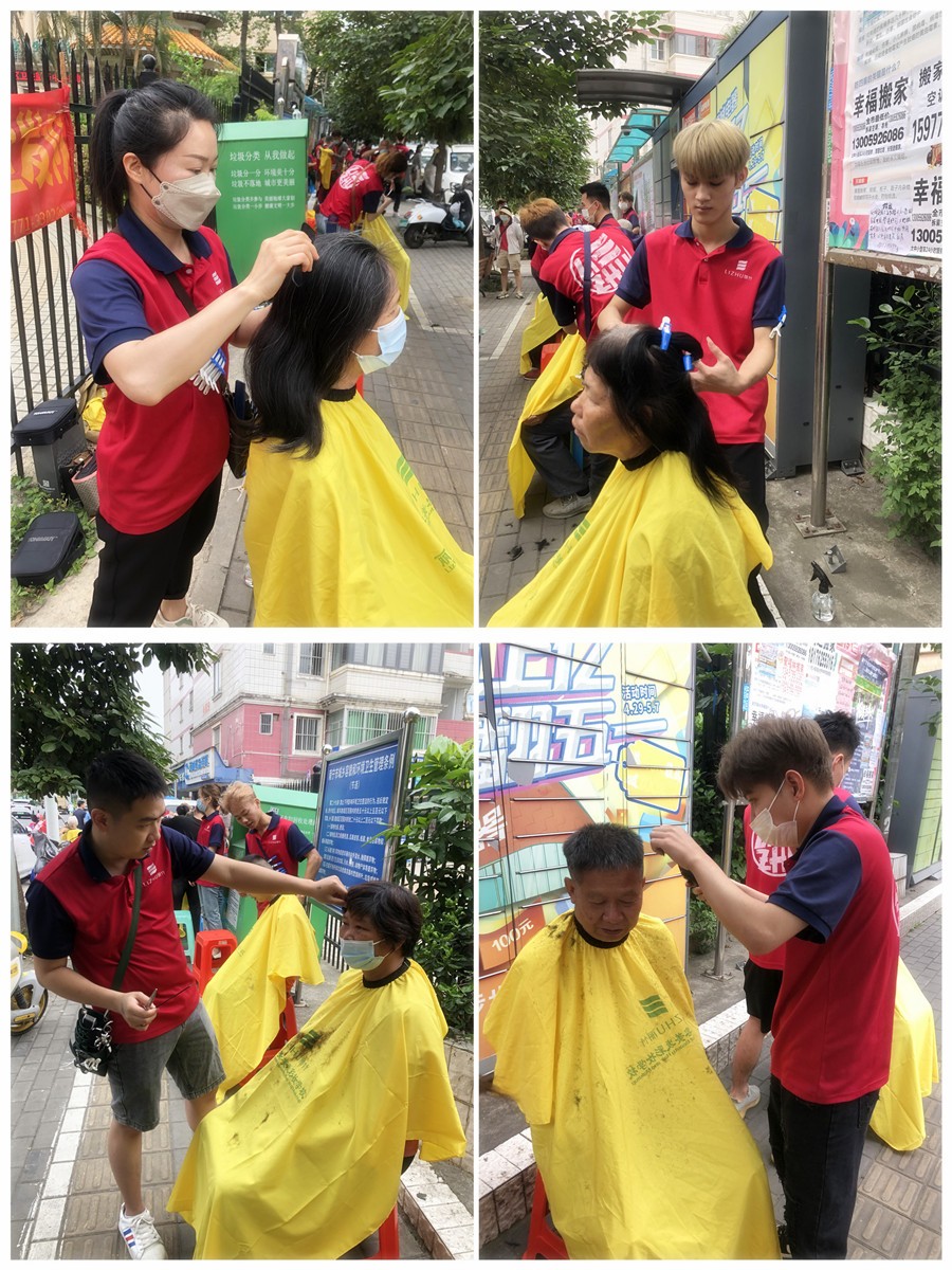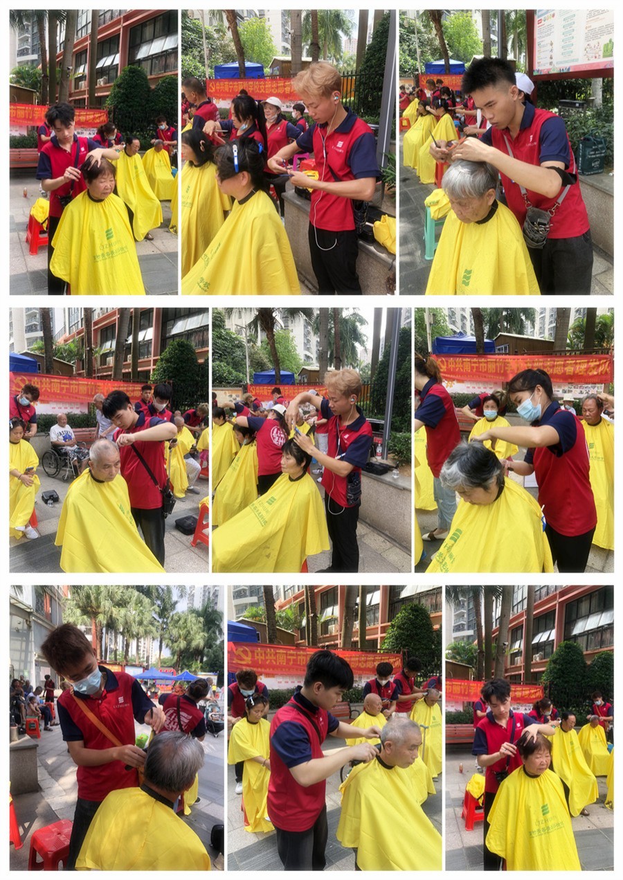 2023年5月26日,南寧美發(fā)培訓(xùn)班志愿者們?yōu)榻先A府小區(qū)居民進(jìn)行理發(fā)活動