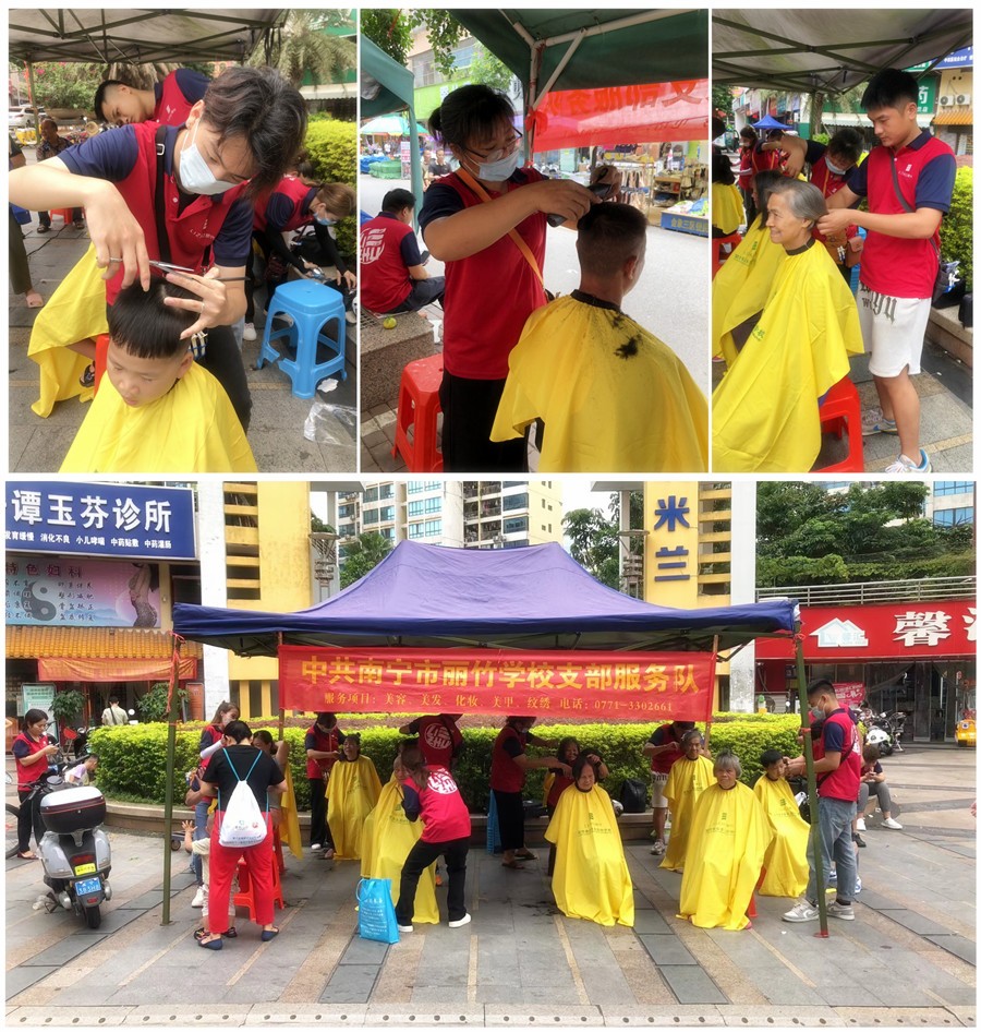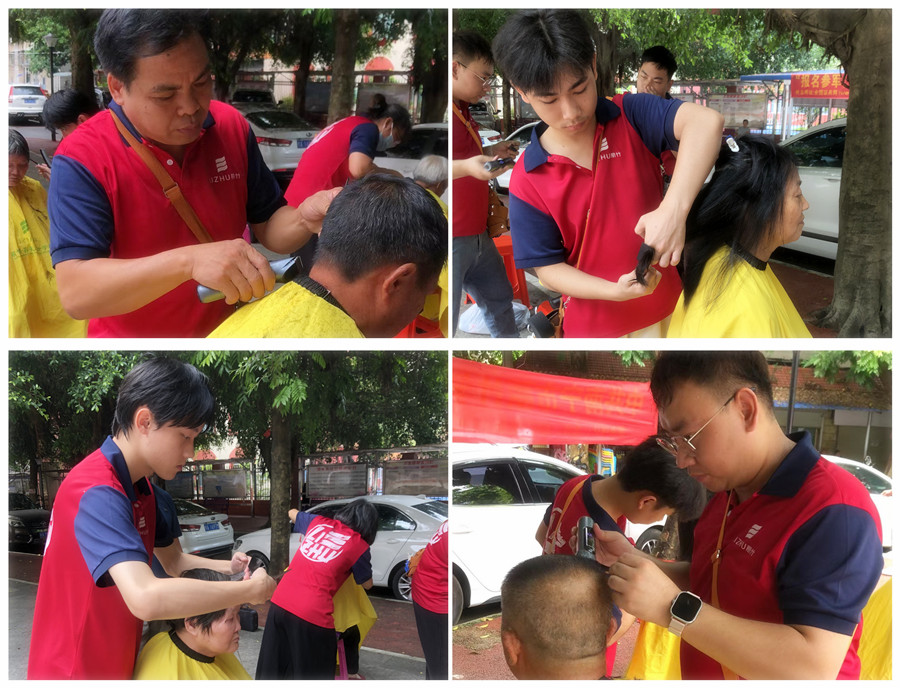 廣西美發(fā)義剪、廣西美發(fā)剪發(fā):隨著氣溫的日益升高,南寧市氣象中心也發(fā)布了高溫預(yù)警。面對(duì)滾滾襲來(lái)的熱浪,廣西美發(fā)剪發(fā)職業(yè)學(xué)校(麗竹美發(fā)剪發(fā)職業(yè)學(xué)校)的同學(xué)們?cè)诶蠋煹膸ьI(lǐng)下,來(lái)到各大小區(qū)進(jìn)行外出教學(xué)實(shí)踐之余,也為居民送去夏日清涼,免費(fèi)為大家進(jìn)行理發(fā)服務(wù)。