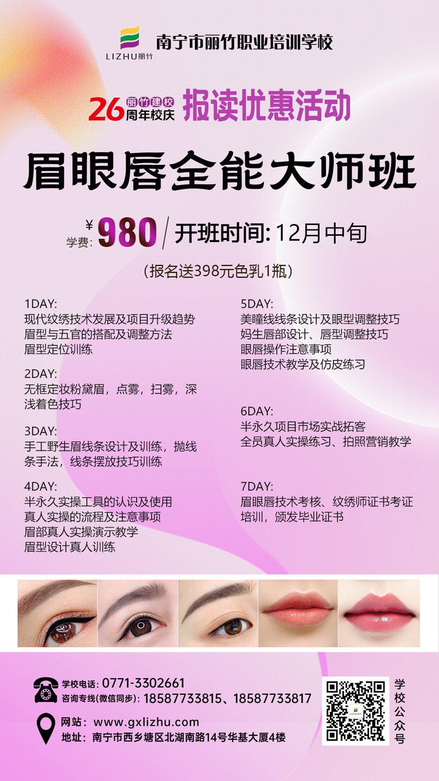 年前給自己一個快速學習一門技術(shù)的機會,抓住今年的尾巴,為新一年的到來開個好頭。南寧紋繡師培訓-麗竹學校12月紋繡全能班(眉眼唇全能大師班)啟動開班招生中,現(xiàn)在報名僅需980元,還能額外贈送398元色乳1瓶。想在南寧學紋繡的小伙伴,趕緊聯(lián)系我們報預定學習名額的吧!