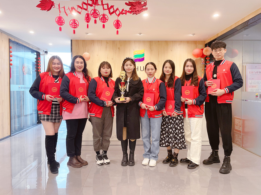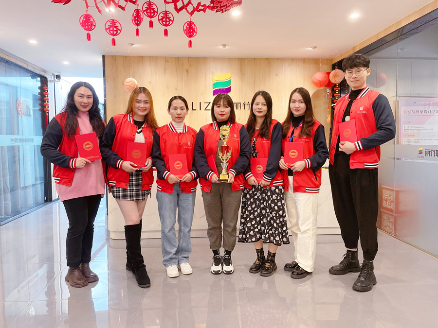麗竹學(xué)校美甲專業(yè)代表隊與賽前指導(dǎo)姚老師合影