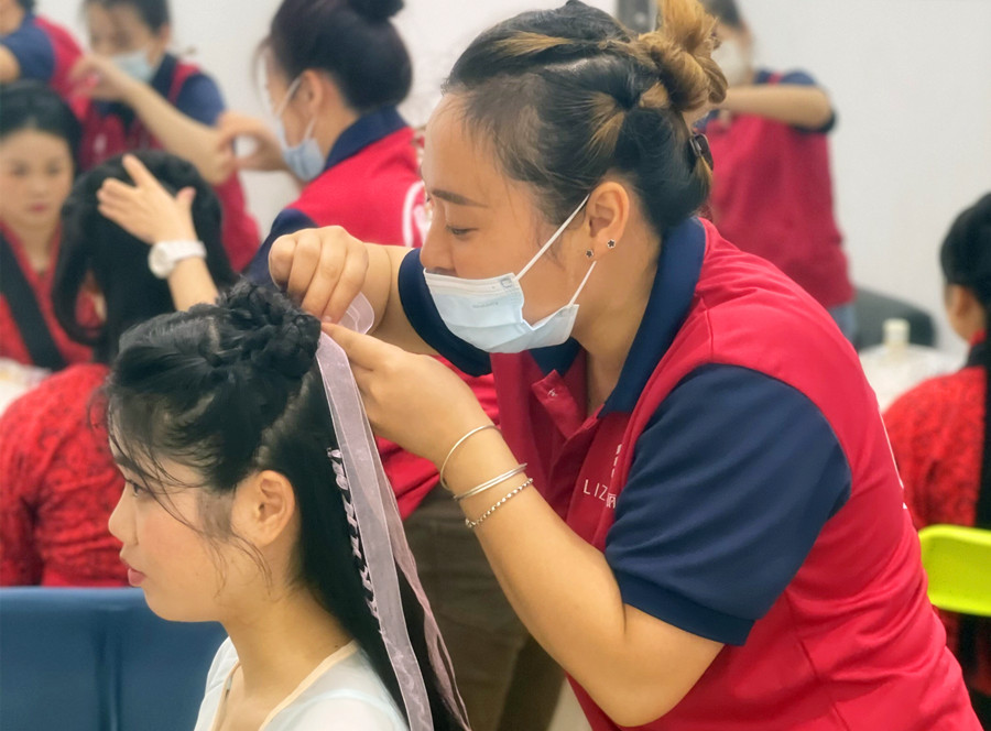 除了妝容的難度,在學(xué)習(xí)發(fā)型課程時,我也覺得困難重重。比如,在做秀禾發(fā)型卷筒的操作時,卷著卷著就突然不知道該如何收尾?又或者是做完后一看,才發(fā)現(xiàn)做出的形狀和老師的不一樣,不僅沒有美觀度,而且還松塌。然后在做赫本包時,倒梳頭發(fā)沒到位,每次倒梳之后捋順赫本包又變小了。披發(fā)兩邊方向燙的不一致……
