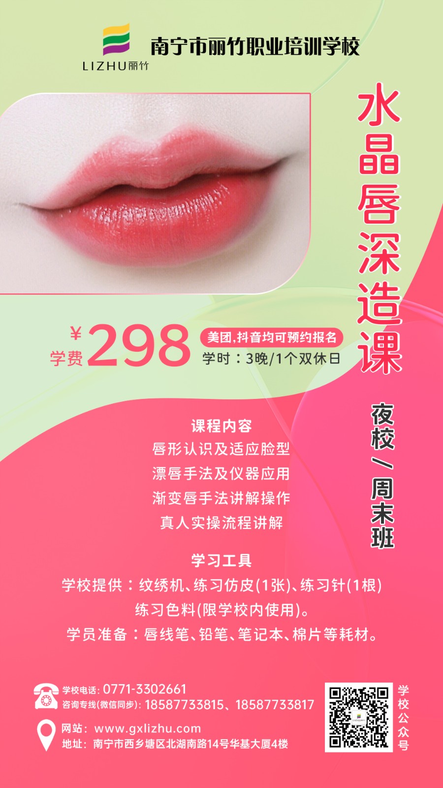 廣西彩妝造型學(xué)校、廣西美甲培訓(xùn)、廣西美容短期班、廣西培訓(xùn)紋唇、廣西紋繡眉眼唇學(xué)習(xí)分享:麗竹學(xué)校特色課程(夜校/周末班)熱門火爆技能課程重磅來襲啦!課程涵蓋化妝,美甲,美容,紋繡等技能,感興趣的小伙伴趕緊關(guān)注麗竹學(xué)校了解更多課程詳情和現(xiàn)在正在進(jìn)行的優(yōu)惠活動詳情。